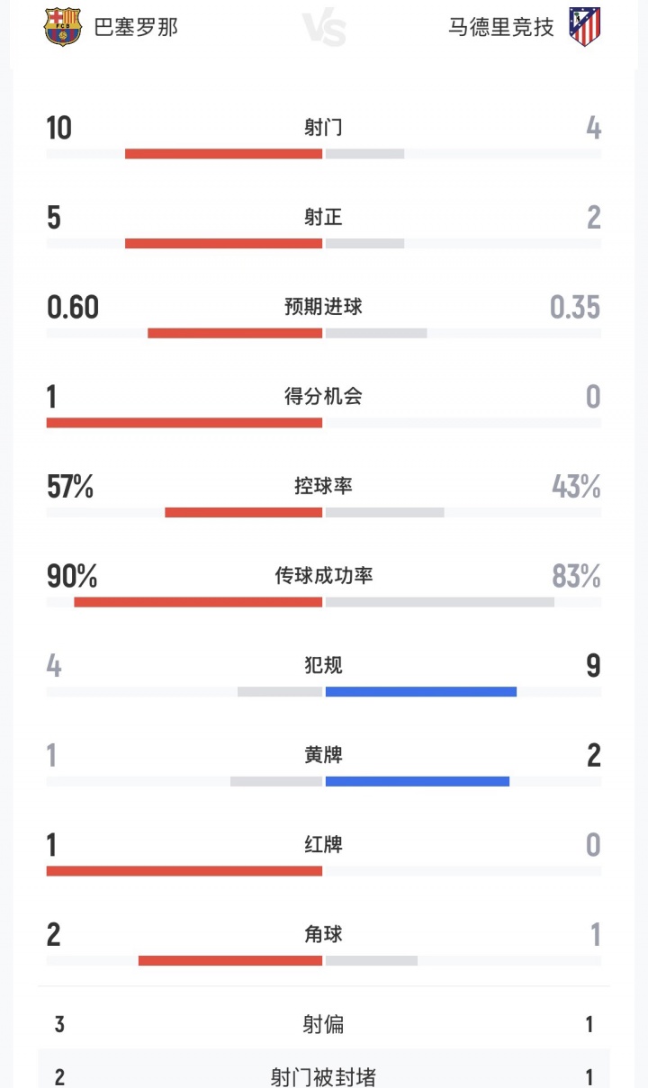 库巴西染红!巴萨vs马竞半场数据:射门10-4,射正5-2,犯规4-9