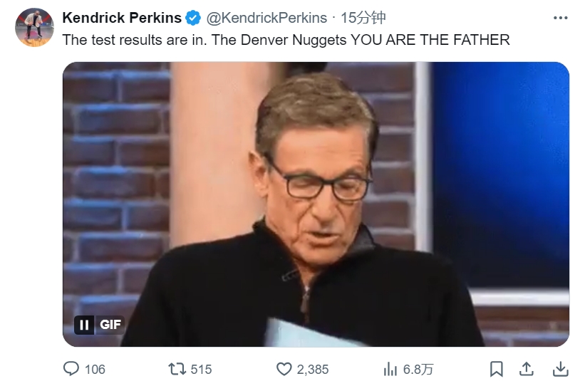 赛后,名嘴帕金斯发推表示:“亲子鉴定结果出来了!掘金你们确实是爸爸!”