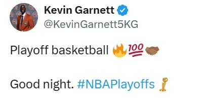 赛后,加内特更推道:“季后赛篮球,晚安。”